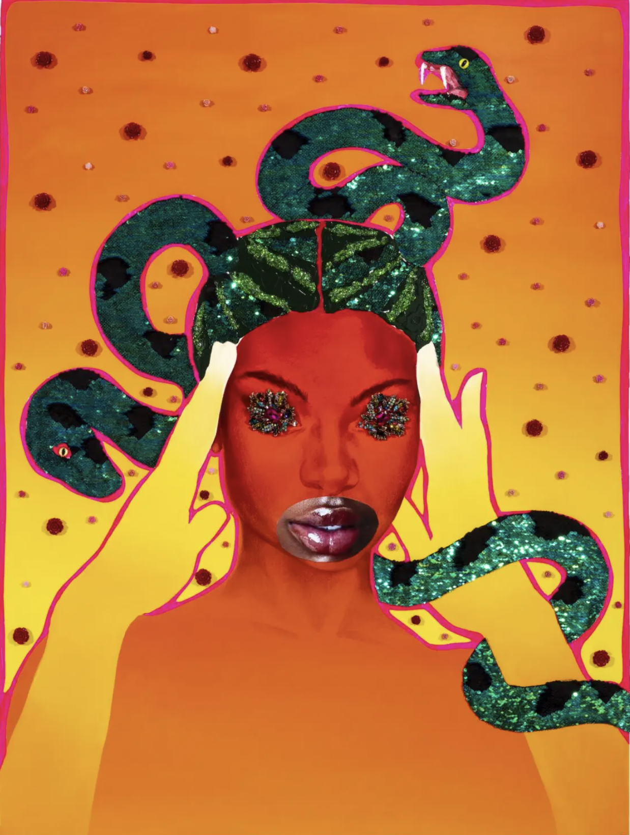 Cuando te encuentras con una obra de Shimoyama, la reconoces de inmediato, lo cual es un objetivo crucial en la carrera de un artista, ya que muestra personalidad, carácter y singularidad. Los colores vibrantes, el uso de purpurina y lentejuelas, destacando los rasgos faciales, el uso de serpientes, ojos y flores, el artista representa figuras que exudan coraje, fuerza y poder. Como una forma de decir: estos somos nosotros, existimos y no vamos a permanecer más en silencio y escondidos.
