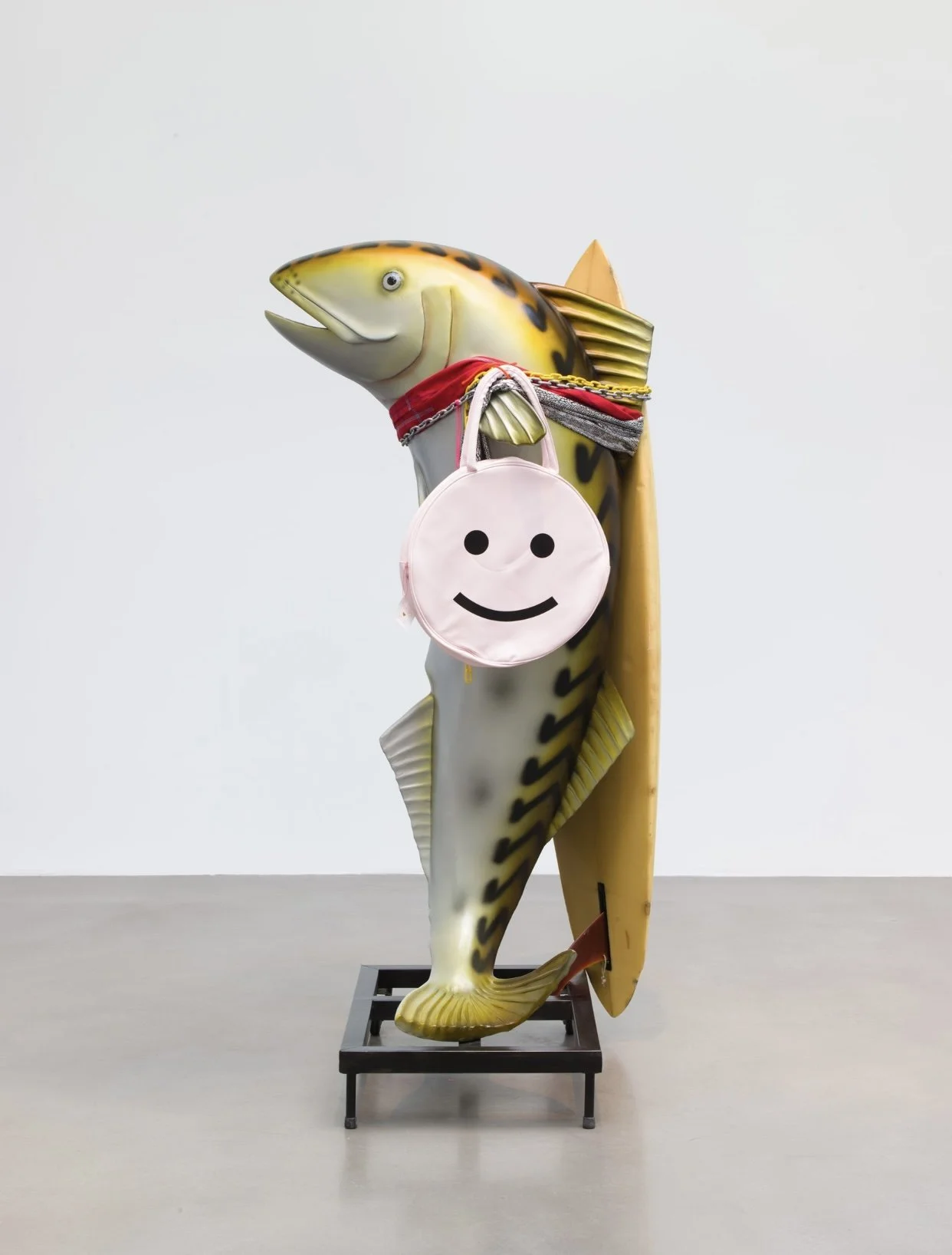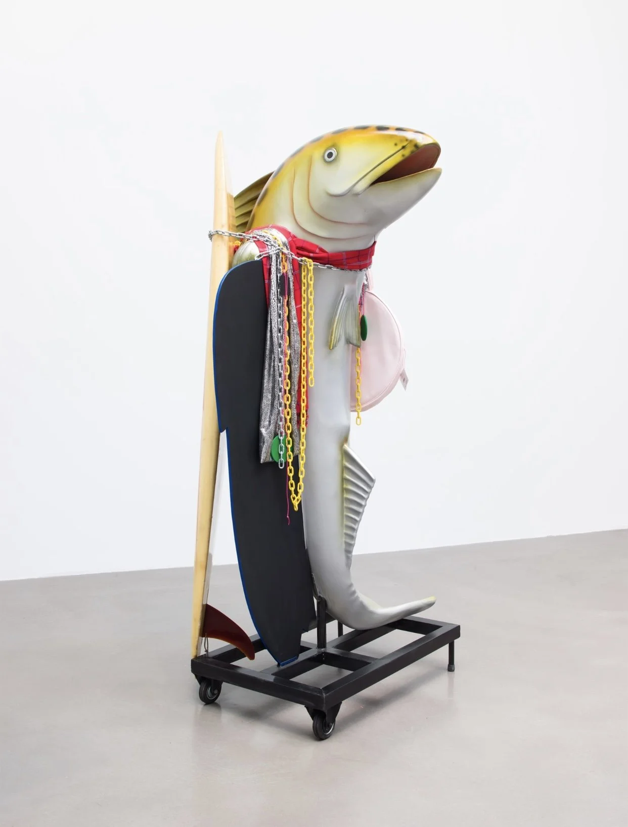 Cosima von Bonin. WHAT IF IT BARKS 4 (GERRY LOPEZ SURFBOARD VERSION), 2018. Plástico, tela, madera, soporte de acero, cadenas, tabla de surf de Gerry López de los 70, cordel, bolsa hielera con cara sonriente de cuero/plástico, bufandas. 79.0 x 45.0 x 40.5 (inches). Petzel.