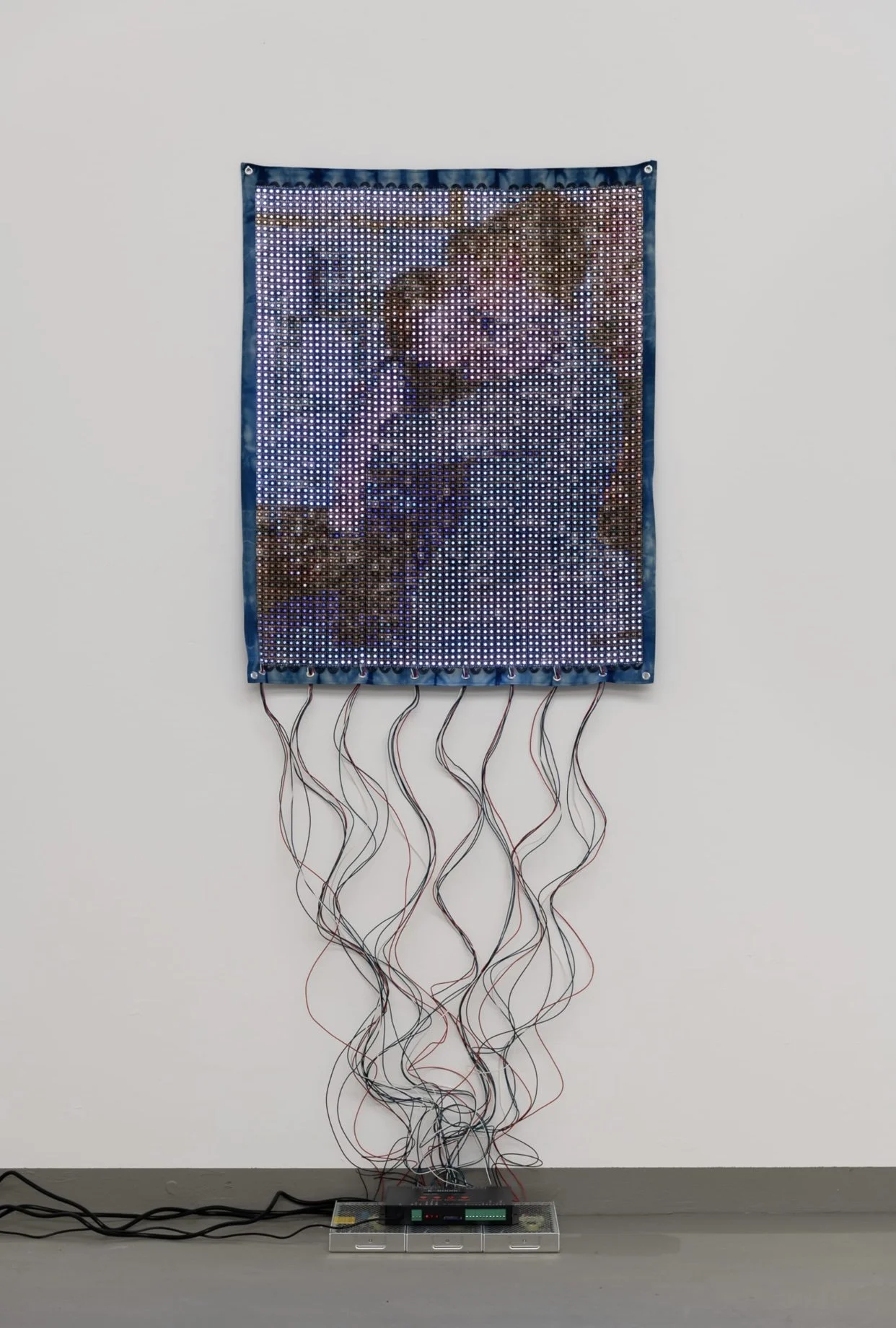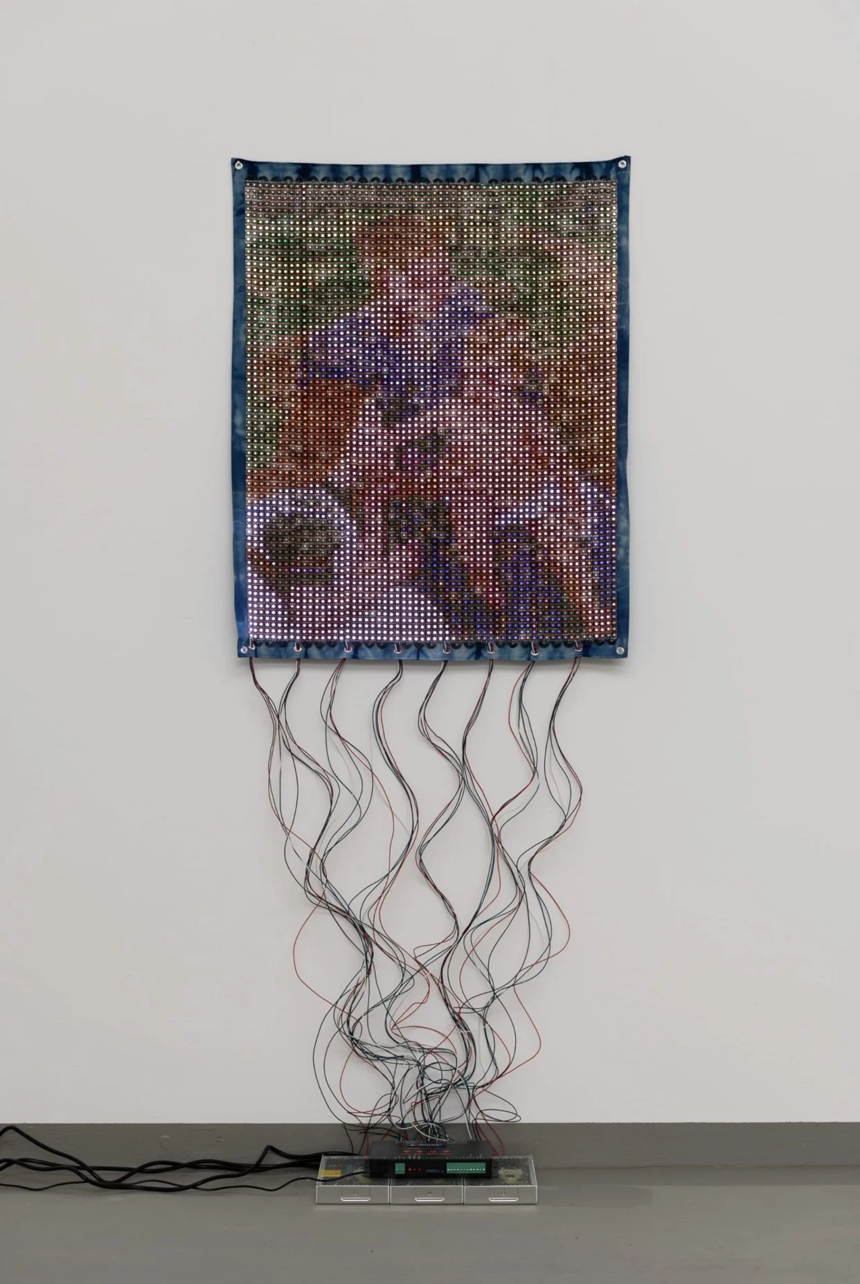 Ei Arakawa. Don't Give Up (Mary Cassatt, Mother and Child, c. 1889, & The Family, c. 1886), 2022. 4500 LEDs en tela teñida a mano con ojales, controlador K-8000C, tarjeta SD de 8GB, fuente de alimentación 3x 5V 80A con cable trenzado 22 AWG, 1 transductor Tectonic TEAX25C10-8/SP, doble cartón corrugado, amplificadores estéreo Lepai LP-2020TI, 1 reproductor multimedia MP3. 82.0x 66.0 (cm). Galerie Max Mayer.