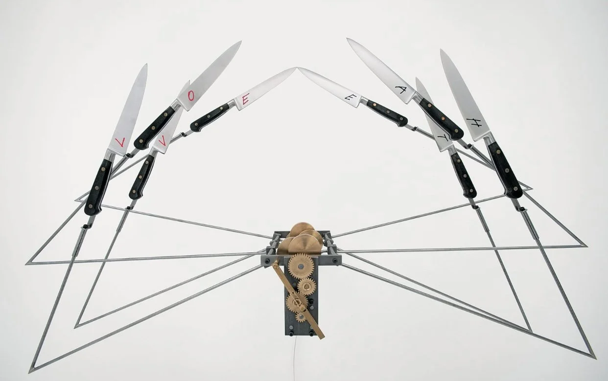 Rebecca Horn. Love and Hate. Knuggle Dome for James Joyce, 2004. Cuchillos, construcción de metal, motor. 60.0 x 110.0 x 40.0 (cm). Galerie Thomas Schulte.